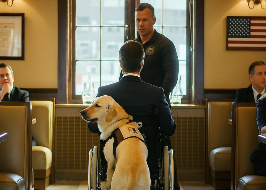 Jake Morrison őrmester nyugodtan lépett be, mellette sétált Rex, a segítőkutyája. A kutya sárga, hivatalos mellénye élesen kontrázott arany szőrével. Jake mindent előkészített: az asztalfoglalást, a kerekesszékes hozzáférést, még az otthoni manőverezést is gyakorolta. Ez a vacsora számított. Két év telt el a robbanás óta – két év, hogy újra megtanulja, hogyan lássák másként.
